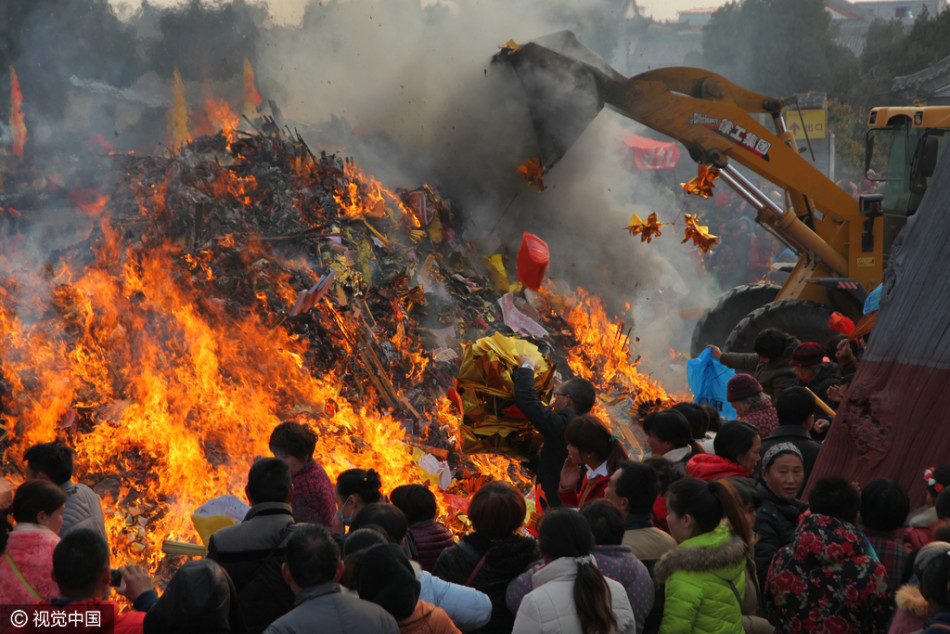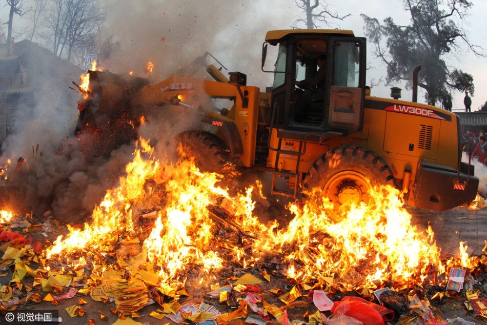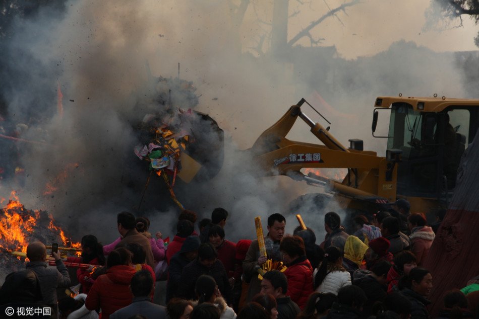 太昊陵廟會(huì)上燒高香的群眾和清理香火的鏟車。供圖:視覺中國(guó)