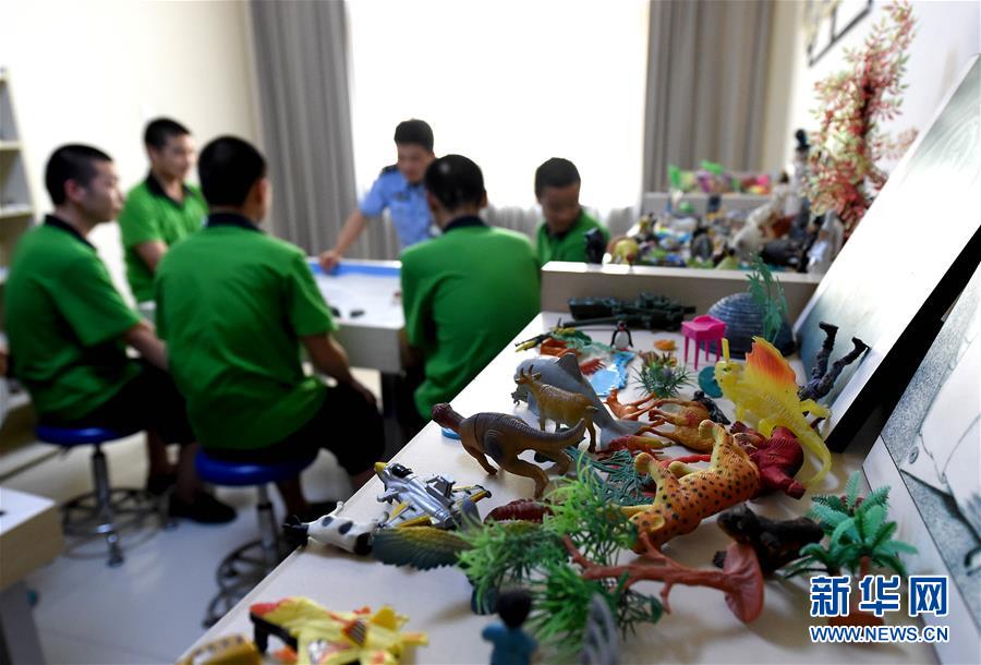 6月22日,河南省未成年人強制隔離戒毒所內(nèi)的戒毒人員在心理治療室內(nèi)做沙盤游戲。 新華社記者 李安 攝