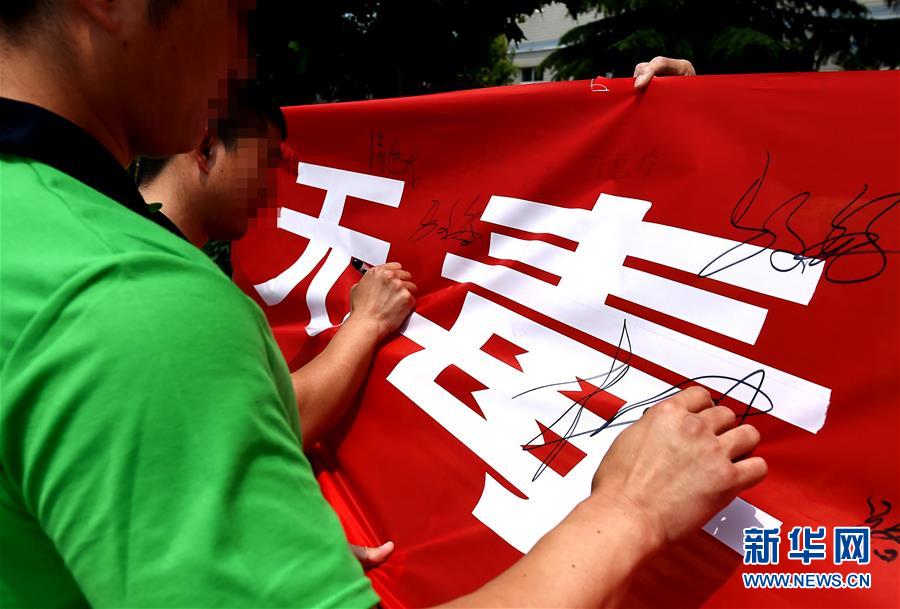 6月22日,河南省未成年人強制隔離戒毒所內(nèi)的戒毒人員在“無毒青春健康生活”條幅上簽名。新華社記者 李安 攝