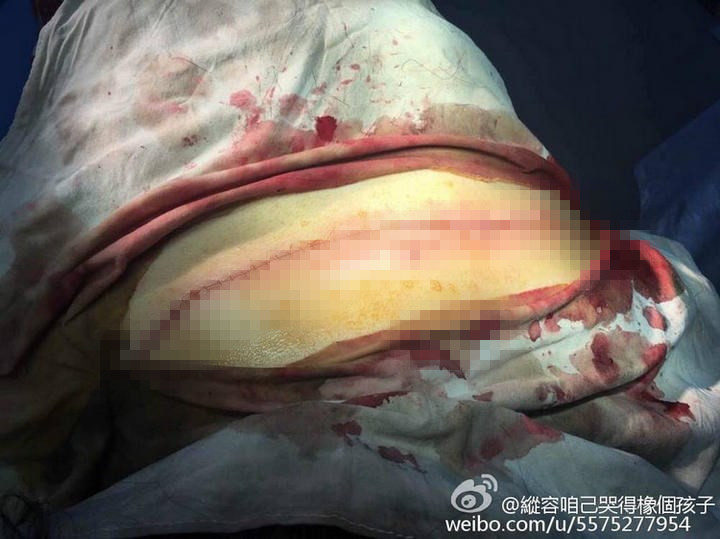 在醫(yī)院治療時,有人幫她拍下一組照片。其中一張,該年輕女子趴在手術(shù)臺,可明顯看到其后頸下方15厘米處,有一條從左手腋窩延生至右肩的傷口,醫(yī)生正對其進行手術(shù)。而另一張圖片,是其傷口縫合后情況,背部有一條如蜈蚣般的傷痕,令人觸目驚心。
