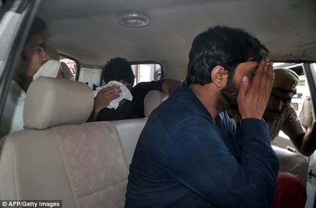 受害女子稱(chēng):“我離開(kāi)學(xué)校,看見(jiàn)了他們,相同的5個(gè)人。我非常害怕?!笔芎θ烁嬖V當(dāng)?shù)匾患译娨暸_(tái),“他們強(qiáng)迫我進(jìn)入車(chē)?yán)铮噲D扼死我。他們威脅說(shuō)要?dú)⑺牢业母赣H和兄弟?!眻D為3名涉嫌強(qiáng)奸女子的嫌疑人被捕時(shí),用手遮住臉。