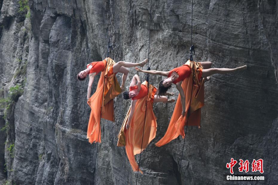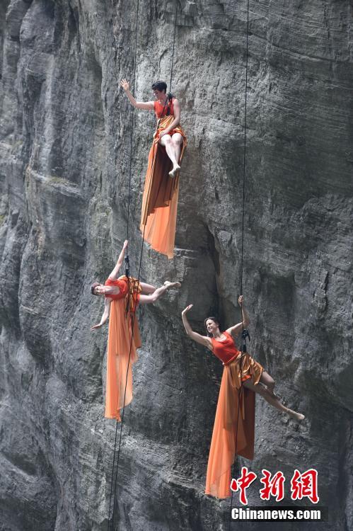 9月13日,美國BANDALOOP高空舞蹈團在湖南張家界天門山的懸崖絕壁間盡情展現(xiàn)“垂直舞蹈”的藝術(shù)與魅力,其優(yōu)雅而驚險的舞姿與鬼斧神工般的自然奇景融合、互動,吸引了不少游客駐足欣賞。中新社發(fā) 向韜 攝
