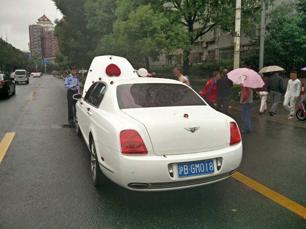 下午2點45分許,上海交警總隊機動支隊巡邏時,在周家嘴路近大連路處發(fā)現一路婚車車隊,共計5輛車,其中領頭的是懸掛“滬BGM018”牌號的白色賓利歐陸跑車。后經查實,此車為套牌車。