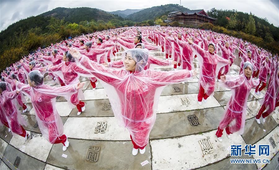 11月7日,在武漢黃陂云霧山,廣場舞愛好者一同起舞。當日上午,在天津、北京、上海、武漢、濟南等14個城市的不同場地上,50085人共同起舞,創(chuàng)下新的最大規(guī)模排舞(多場地)吉尼斯世界紀錄。新華社記者肖藝九攝