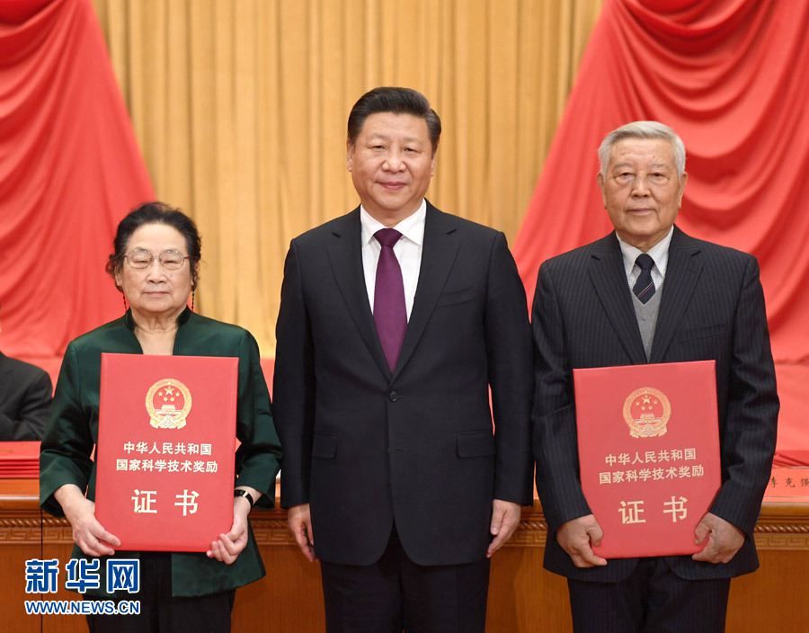 1月9日,2016年度國家科學技術獎勵大會在北京人民大會堂隆重舉行。中共中央總書記、國家主席、中央軍委主席習近平向獲得2016年度國家最高科學技術獎的中國科學院物理研究所趙忠賢院士(右)和中國中醫(yī)科學院屠呦呦研究員(左)頒獎。新華社記者 李學仁 攝