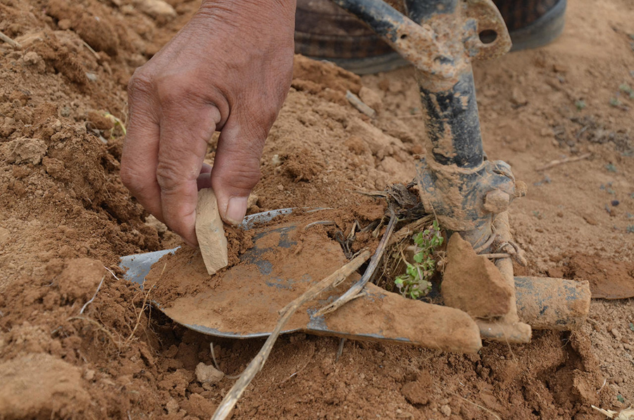 說是鋤,看起來又像犁,地里有墑,用一段就要用瓦片把泥土刮去,要不推起來就會(huì)費(fèi)力,這個(gè)動(dòng)作和鋤地一樣,鋤過地的都知道。
