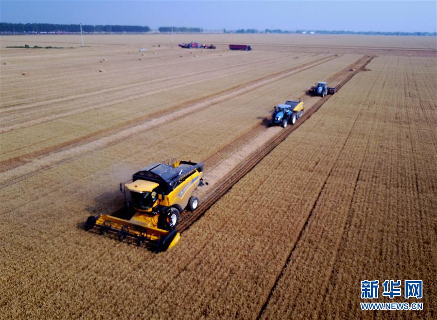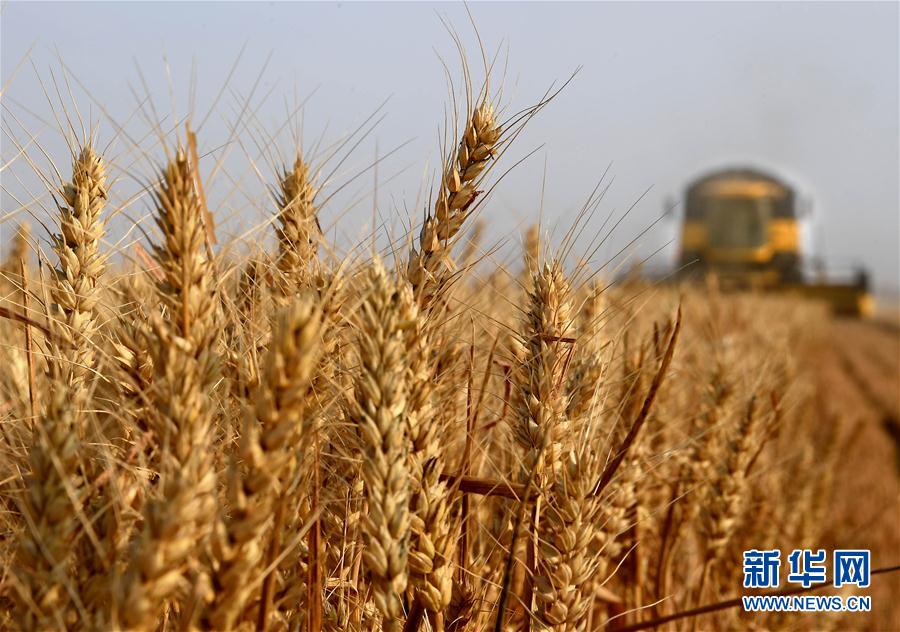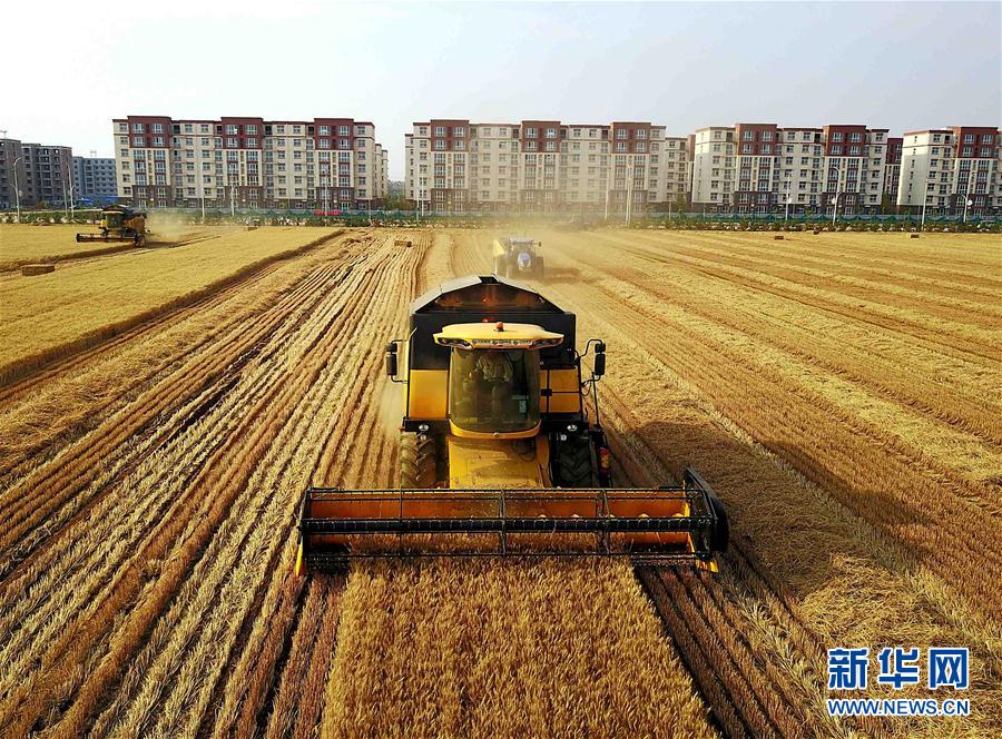 6月7日,在河南??h中鶴現(xiàn)代農業(yè)示范園區(qū)的麥田里,收割機在收獲小麥。新華社記者 李安 攝