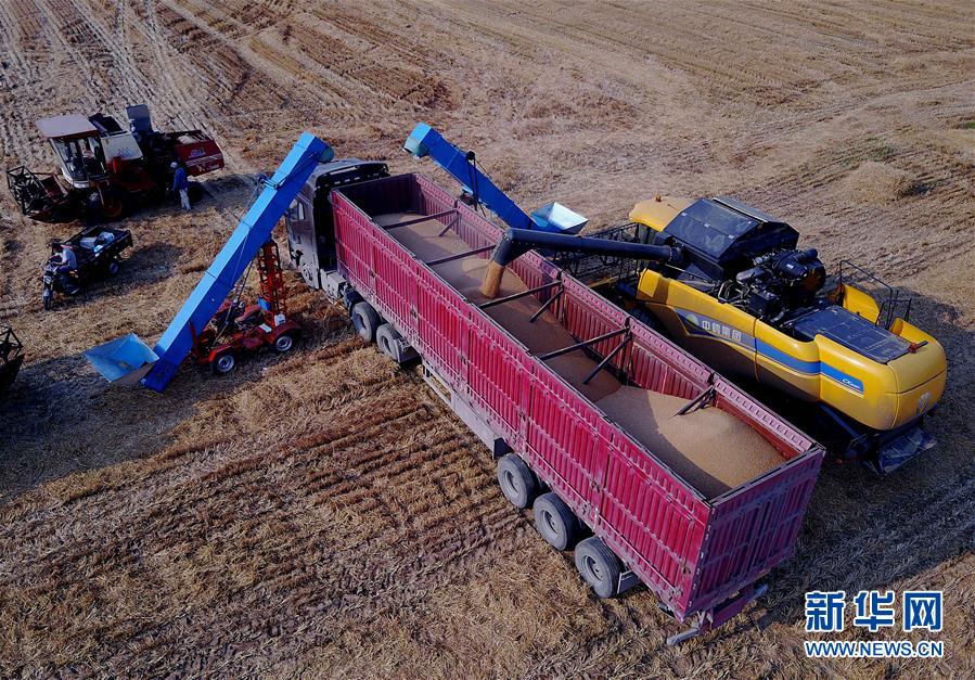 6月7日,在河南??h中鶴現(xiàn)代農業(yè)示范園區(qū)的麥田里,一臺收割機將收獲的小麥裝車。新華社記者 李安 攝