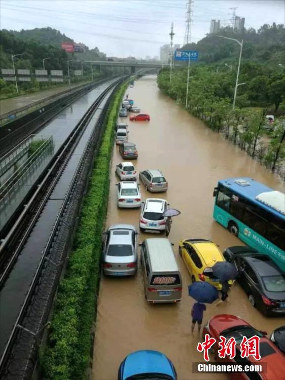 7月18日,深圳普降大暴雨局部特大暴雨,致部分路段嚴(yán)重積水、山體滑坡道路中斷、交通擁堵等險(xiǎn)情。深圳鹽田區(qū)盤山公路恩上路段出現(xiàn)滑坡,無人員、車輛被困;深鹽二通道下沙頭角出口匝道中間因山水傾瀉,道路中斷,交警已經(jīng)實(shí)施了交通管制。當(dāng)?shù)貧庀蟛块T先后發(fā)布了雷電、暴雨黃色、暴雨橙色和暴雨紅色分區(qū)預(yù)警信號(hào)。圖為深圳龍崗金銀坑路段嚴(yán)重積水。中新社記者 鐘欣 攝