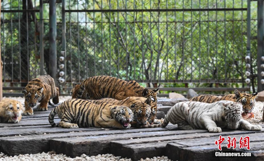 10月17日,濟(jì)南野生動物世界2017年誕生的12只小老虎集中亮相,霸氣模樣吸引許多游客駐足觀賞。據(jù)悉,濟(jì)南野生動物園2017年共繁育成活26只小老虎,其中2只是“虎中極品”金虎。 中新社記者 張勇 攝