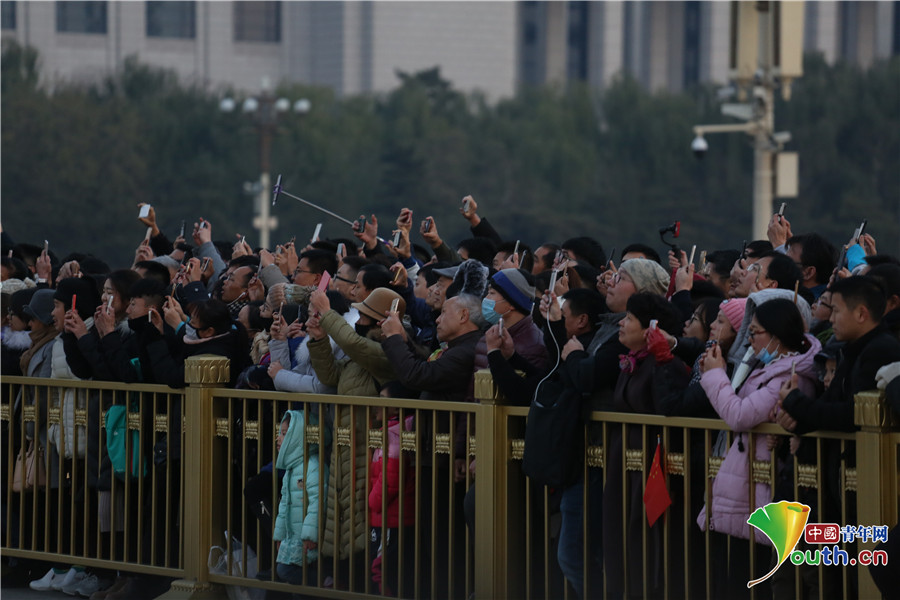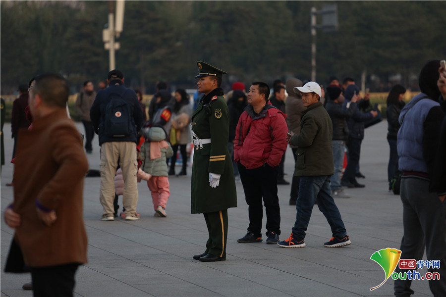 寒風(fēng)中,觀看降旗儀式的游客們。中國青年網(wǎng)通訊員 李超 攝