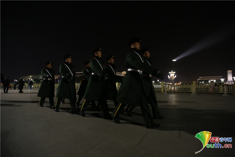 領(lǐng)班員李雪雷站著挺拔的軍姿在廣場中間執(zhí)勤,絲毫看不出他的“冷”。中國青年網(wǎng)通訊員 李超 攝