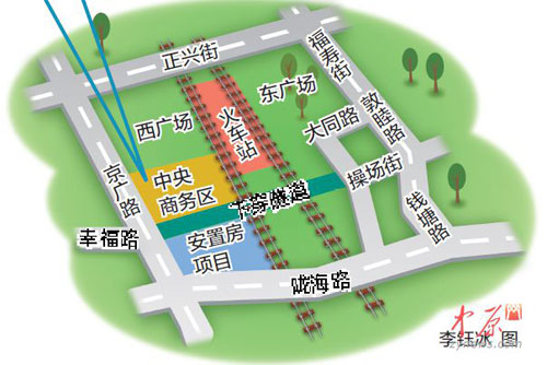 讓人欣喜的是,西廣場南側的幸福路將連接火車站東西兩個廣場,打通下穿隧道。幸福路南起京廣路,北到操場街,不但可行駛機動車,還可供非機動車、行人通行。從規(guī)劃圖上可看出,規(guī)劃中的幸福路,和現(xiàn)狀幸福路,不在一條直線上,它們在京廣路上有拐角。