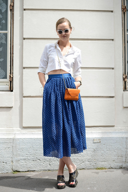 雪白干凈的襯衣加上藍(lán)色鏤空雕花百褶棉布長(zhǎng)裙,夏天這么清清爽爽就很好,兩個(gè)顏色都干凈純粹,沒有一點(diǎn)夸張激烈的視覺沖突,所日才如此備受好評(píng),你看夏日最受寵的白T恤配牛仔也是藍(lán)天白云的基調(diào)。