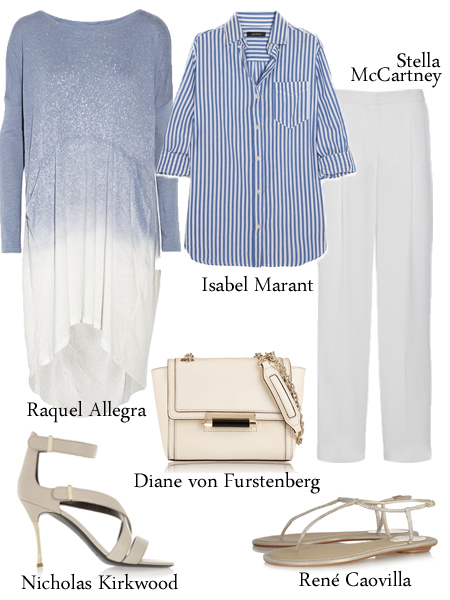 一條淡藍(lán)色的雪紡裙在夏天是必不可少的,抽褶的吊帶不規(guī)則裙擺都體現(xiàn)青春風(fēng)動(dòng)的輕快姿態(tài),白色單肩包和做舊款涼鞋仿佛回歸童年時(shí)的單品,美好而天真。