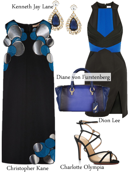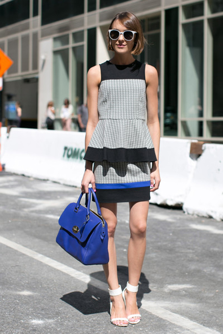 這套藍(lán)色連衣裙也是腰間插荷葉邊款式,因面料的挺括質(zhì)感和上半身的開胸設(shè)計(jì)取勝,性感不失大氣,荷葉邊的參差也帶來(lái)設(shè)計(jì)上的突破和新穎,另外藍(lán)色手拿包和嫩黃色高跟鞋也搭配的恰到好處,呼應(yīng)又不乏悶。