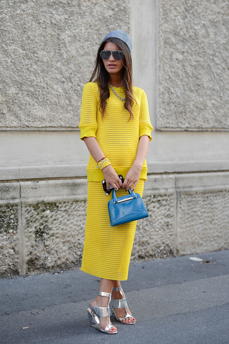 全身黃色搭配也是如此,青春靚麗之余一抹清新的藍(lán)色和前衛(wèi)的銀白色會(huì)洗去黃色的甜膩感,拼湊出別具品格的時(shí)髦狀態(tài)。