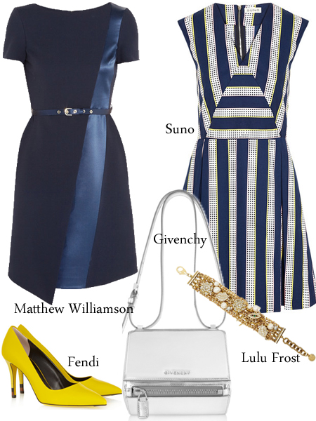 如果藍(lán)色和白色是清新的組合,那么藍(lán)色和黑色則是嚴(yán)謹(jǐn)律政佳人的標(biāo)配,皮革在藍(lán)黑條紋和褶裥的錯(cuò)落下仿佛鋼琴鍵般抑揚(yáng)頓挫,單肩包和黑色漆皮高跟鞋則一唱一和將整體搭配湊得完整和諧。