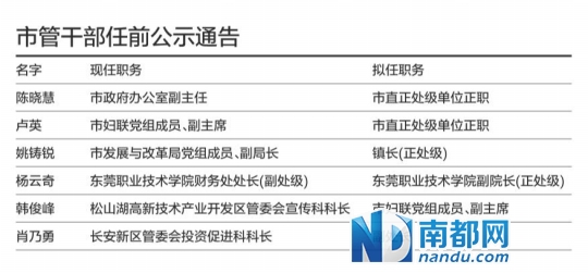 此外,東莞職業(yè)技術(shù)學(xué)院財(cái)務(wù)處處長(副處級)楊云奇將擬任東莞職業(yè)技術(shù)學(xué)院副院長(正處級);長安新區(qū)管委會投資促進(jìn)科科長肖乃勇則擬任副處長。