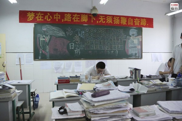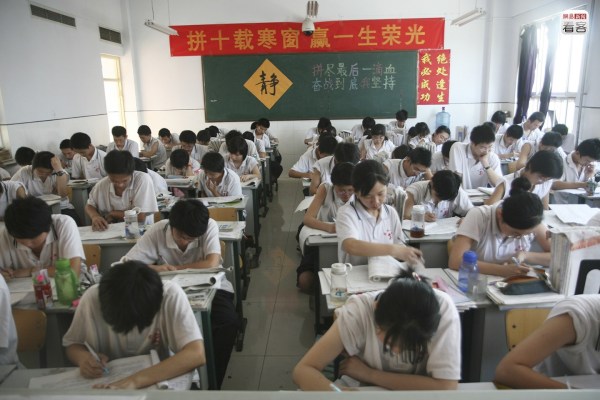 很難說在這種狂熱的氣氛下,學(xué)生們是不是真的能靜下心來。與狂熱氣氛相對(duì)的,是“冷”、“靜”這樣的詞匯的常見,不少教室也貼著“冷靜”的提示。圖為2012年6月2日,學(xué)生們準(zhǔn)備高考。