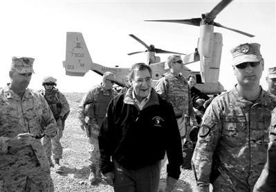 14日,正在阿富汗訪問的美國國防部長帕內(nèi)塔乘軍機抵達(dá)一處軍事基地