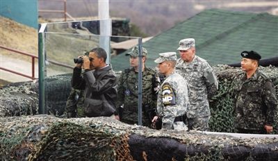此后,奧巴馬步行進入三八線,抵達一處哨所。這一哨所距離韓朝分界線不到100米。在哨所里,奧巴馬拿起雙筒望遠(yuǎn)鏡,隔著防彈玻璃,先朝著朝鮮方向看了看,然后又回過頭,看了看韓國方向。隨行的美國媒體報道稱,奧巴馬在哨所里觀察了大約10分鐘。