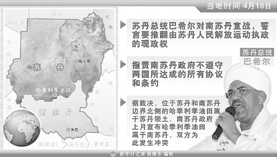 卡塔爾半島電視臺19日援引蘇丹官方通訊社的消息說,蘇丹總統(tǒng)巴希爾當天在北科爾多凡州首府歐拜伊德的群眾集會上發(fā)表講話,稱只有用大棒才能懲罰南蘇丹,蘇丹將通過軍事手段解放南蘇丹。