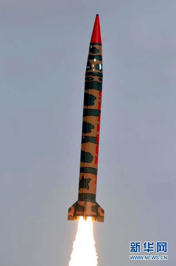 這張由巴基斯坦國(guó)際公共關(guān)系服務(wù)部門(mén)(ISPR)4月25日發(fā)布的照片顯示了成功發(fā)射的可攜帶核彈頭的中程彈道導(dǎo)彈。巴基斯坦軍方25日發(fā)表聲明稱,巴基斯坦當(dāng)天成功發(fā)射了可攜帶核彈頭的中程彈道導(dǎo)彈,并成功擊中海上預(yù)定目標(biāo)。