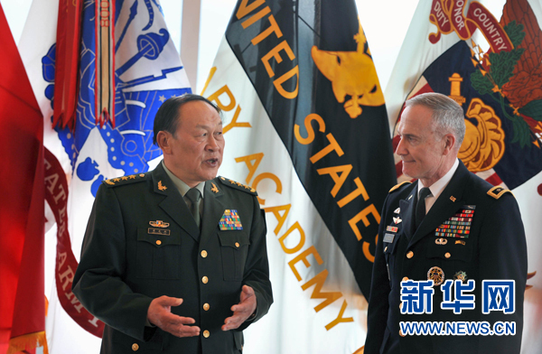 5月10日,中國國務(wù)委員兼國防部長梁光烈(左)在美國西點(diǎn)軍校會(huì)見西點(diǎn)軍校校長大衛(wèi)·亨頓中將。當(dāng)天,中國國務(wù)委員兼國防部長梁光烈訪問美國西點(diǎn)軍校,向西點(diǎn)軍校贈(zèng)送圖書并與學(xué)生交流。 新華社記者王雷攝
