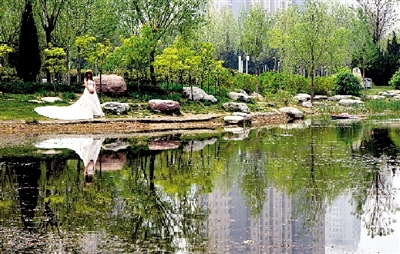 昨日中午,鄭東新區(qū)小樹林,一對新人正在拍攝婚紗照。 記者 馬健 圖