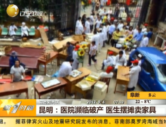 9月1日下午,在位于西山區(qū)麻園路9號的云南博愛醫(yī)院100平方米左右的院子里,各式各樣的家具雜亂地擺放著,有病床、床頭柜,還有護士辦公的前臺。家具中間站著幾十個人,穿著醫(yī)生和護士的制服,賣力地叫賣著。該醫(yī)院副院長稱,博愛醫(yī)院租用的場地到期,而且醫(yī)院投資失敗瀕臨破產(chǎn),只得變賣資產(chǎn)安置醫(yī)護人員。