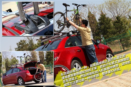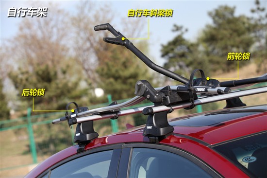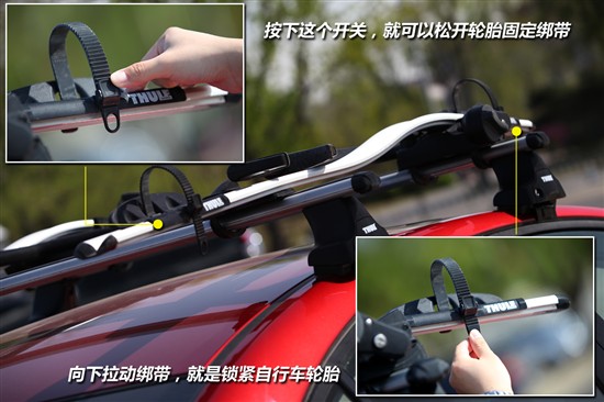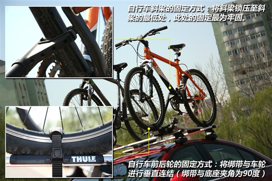 可能有人會覺得這樣安裝自行車還不是很把牢,那沒關(guān)系,您還可以選擇另一套安裝自行車的頂架,它的使用原理是將自行車的前輪卸下、前叉固定在頂架前部,它的好處是比直接固定自行車前輪更加牢固,且因缺少了自行車的前輪,導(dǎo)致車頂之上的物品重心更低,行車也更為安全;但這種方式對使用者的自行車有較高的要求,需要您的山地自行車前輪具有快拆的功能。
