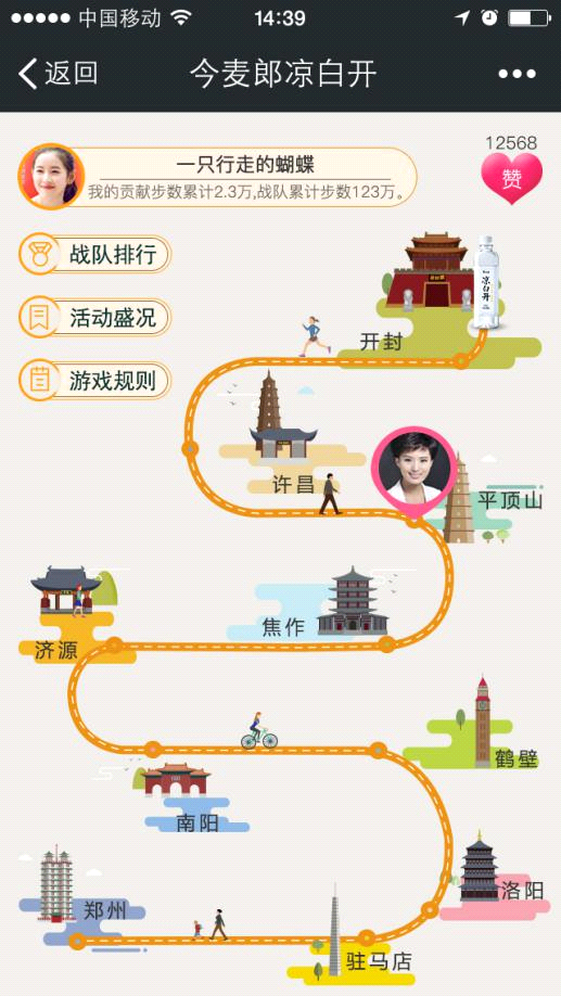 在河南十大名嘴戰(zhàn)隊(duì)中選擇一個(gè)你要支持的戰(zhàn)隊(duì)加入,即可為該戰(zhàn)隊(duì)捐贈(zèng)當(dāng)天的微信運(yùn)動(dòng)步數(shù),該戰(zhàn)隊(duì)獲得用戶捐贈(zèng)步數(shù)后可在規(guī)定的線路中前進(jìn),到達(dá)終點(diǎn)為獲勝。