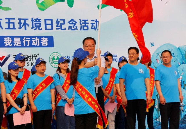 李保興副市長為堅守在環(huán)保路上的洛陽市生態(tài)環(huán)境志愿服務隊的志愿者授旗↑↑