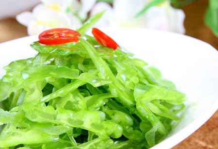 苦瓜可炒食、煮食或蒸食,清苦爽口,先苦后甜,口味長久。如將苦瓜和辣椒同炒,可減輕苦味。將其切成薄片,然后在上面灑上一些鹽漬。一會(huì)兒,再用水把鹽濾掉;也可以把苦瓜切成塊,然后煮熟,放進(jìn)冷水中浸泡,這樣苦瓜的苦味就會(huì)減少許多。