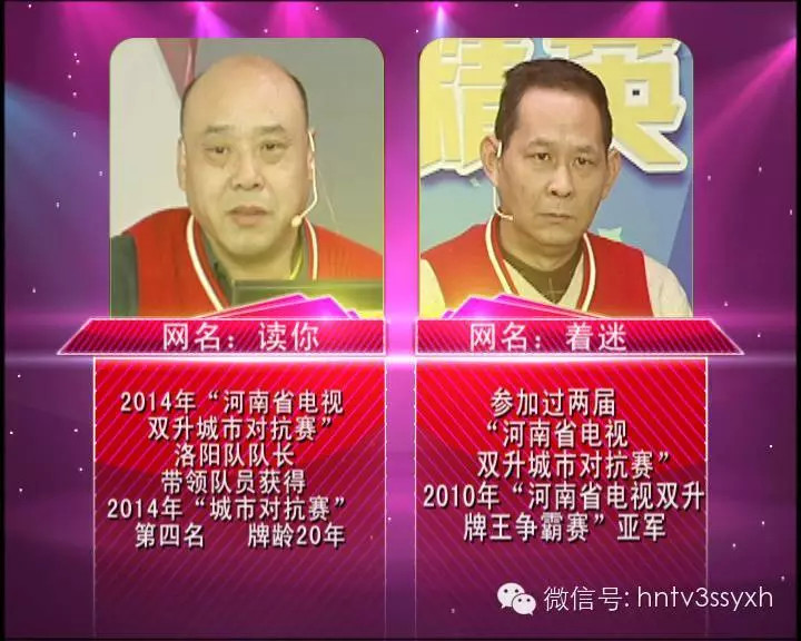 今晚將要比拼的是精英賽下半?yún)^(qū)第1輪的第4場比賽,說到選手陣容,可以說是實至名歸的精英牌手。“讀你”和“著迷”都來自洛陽,“讀你”牌齡更是長達20年,在2014年城市對抗賽任洛陽隊隊長,并帶領隊員獲得2014年城市對抗賽第四名的好成績?!爸浴痹@得2010年河南省電視雙升牌王爭霸賽亞軍,曾參加過兩屆城市對抗賽,也是洛陽隊的老隊員,實力雄厚。