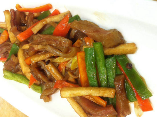 1、牛蹄筋,杏鮑菇,青紅椒切成筷子條狀。