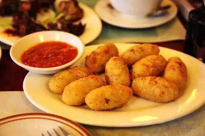 3、團(tuán)成圓球,均勻的裹上面包糠,下入七成熱的油鍋中炸至金黃即可撈出。