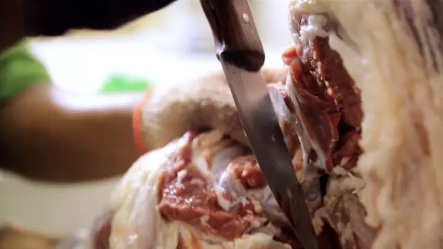選用本地兩個(gè)月的小山羊,據(jù)說體重在40斤左右的口感最好,每天下午進(jìn)行阿訇宰后,肥瘦相間的羊肉就送到了果園,師傅叉起一塊羊油開始抹,這動(dòng)作看的吃貨一頭霧水。