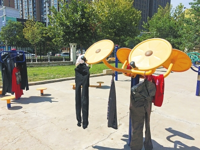 “一有太陽,公共健身器材上就有人晾衣服,想鍛煉一下都成了難事?!奔易〗鹚畢^(qū)未來路附近的廣發(fā)花園劉先生致電本報,本來小區(qū)內(nèi)健身器材是讓大家鍛煉身體的,可是,卻成了居民的“晾曬寶地”。