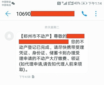 大河報記者了解到,鄭州市不動產(chǎn)登記中心目前正式推出了業(yè)務(wù)辦結(jié)的短信提醒服務(wù)。當(dāng)不動產(chǎn)登記部門在辦結(jié)申請人的相關(guān)申請后,便會給申請人(代理人)發(fā)去短信,提醒其及時前往不動產(chǎn)登記部門領(lǐng)取不動產(chǎn)登記證書、證明。“從業(yè)務(wù)辦結(jié)到領(lǐng)證還有一些內(nèi)部流轉(zhuǎn)程序,一般情況下,我們都是在繕證完成后24小時發(fā)送短信。”相關(guān)負(fù)責(zé)人介紹說。