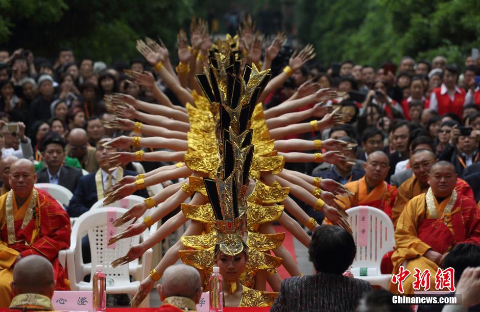 4月28日,演員在金陵禮佛月開幕式上表演節(jié)目《千手觀音》。當(dāng)日,南京靈谷寺開山1500周年慶典暨第四屆金陵禮佛文化月開幕式在紫金山靈谷寺公園無梁殿前舉行。據(jù)悉,禮佛文化月期間還將舉行佛頂骨舍利的恭請(qǐng)法會(huì)、諸圣舍利迎請(qǐng)法會(huì)、講經(jīng)說法、南京國際佛事用品展覽會(huì)等系列活動(dòng)。中新社發(fā) 泱波 攝
