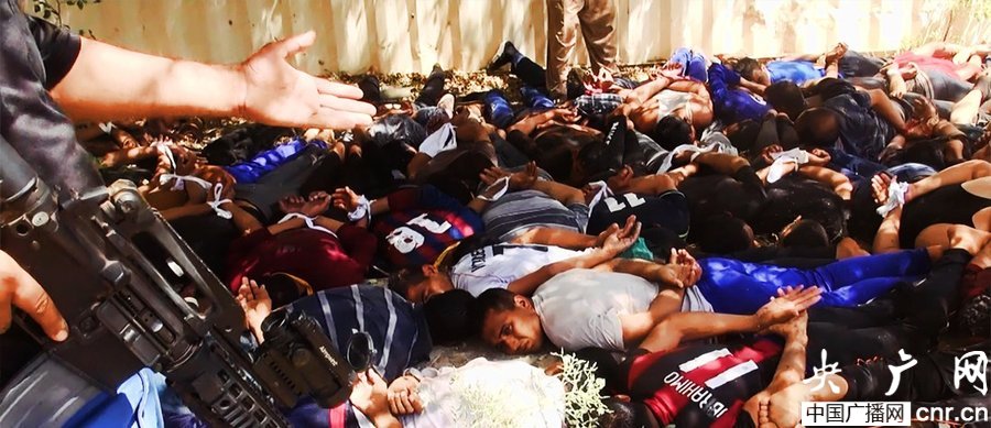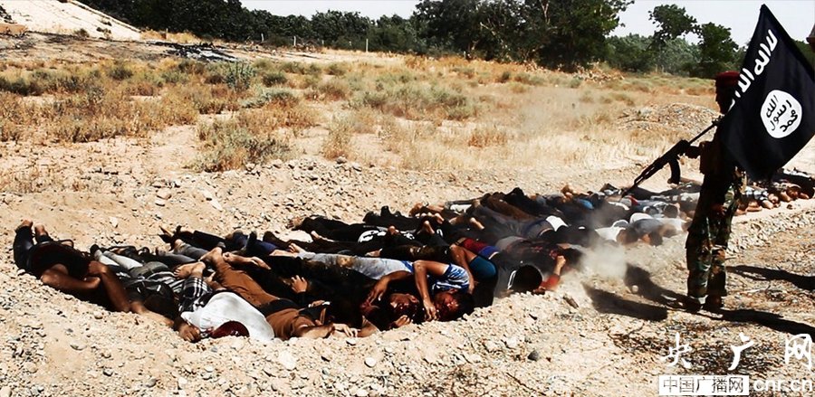 當?shù)貢r間2014年6月14日,伊拉克薩拉赫丁,伊拉克極端武裝“伊拉克和黎凡特伊斯蘭國”武裝人員處決大量俘虜?shù)囊晾耸勘?/p>