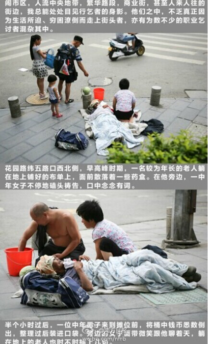 乞丐有真有假。一家人出工,早點吃漢堡,中午買牛肉和啤酒補充能量,一瓶冰鎮(zhèn)啤酒倒瓶里佯裝是藥喂給躺著的人。下午茶是西瓜、冰棍和紅茶,一天工作結(jié)束后美滋滋數(shù)錢數(shù)到手軟。晚飯在一家飯店點了幾個雞腿和幾瓶啤酒。飯后,逛Cartier卡地亞看了腕表。(來源:南方日報)