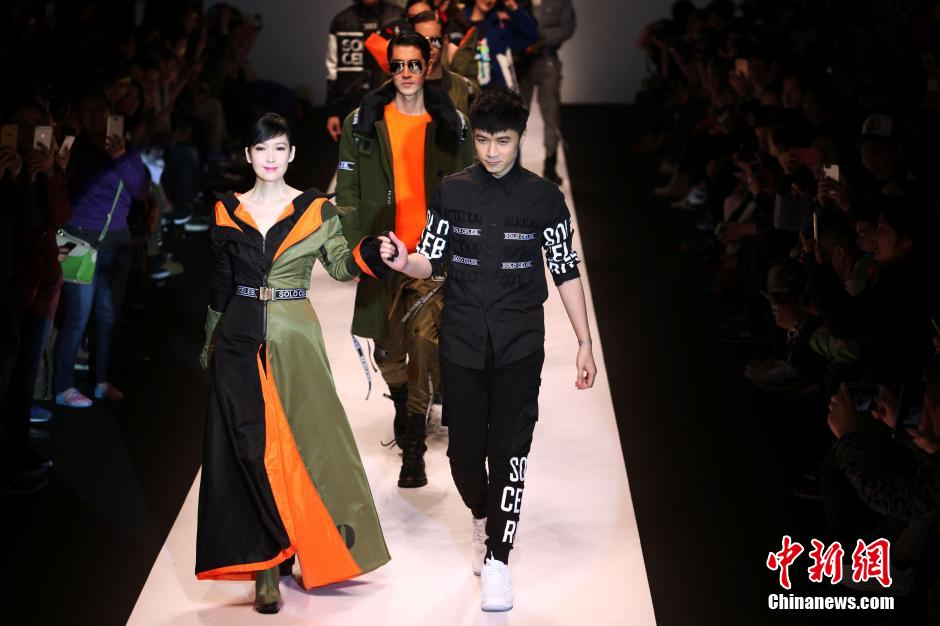 4月13日晚,變身設(shè)計(jì)師的古巨基個(gè)人第一場(chǎng)時(shí)裝發(fā)布會(huì)在上海時(shí)裝周舉行。為支持好友首秀,女神周慧敏特意飛到上海,親自登臺(tái)走秀,驚艷全場(chǎng)。圖為古巨基與周慧敏共同登臺(tái)。 張亨偉 攝