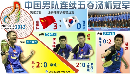 北京,2012年5月27日 圖表:中國(guó)男隊(duì)連續(xù)五奪湯杯冠軍 新華社記者 盧哲 編制
