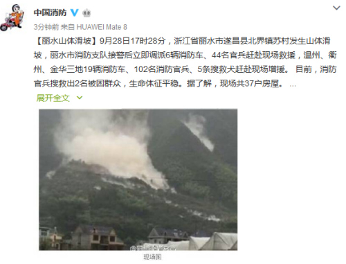 中新網(wǎng)9月28日電 據(jù)公安部消防局官方微博消息,9月28日17時28分,浙江省麗水市遂昌縣北界鎮(zhèn)蘇村發(fā)生山體滑坡,目前,消防官兵搜救出2名被困群眾,生命體征平穩(wěn)。據(jù)了解,現(xiàn)場共37戶房屋。同時,村莊旁邊小溪形成堰塞湖,可能發(fā)生局部二次滑坡。