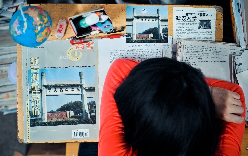 5月25日,復(fù)讀學校內(nèi),學生周康趴在桌子上休息。周康在3月23日的日記里寫道,“追尋心中的理想,一步步向自己理想的大學靠近.....有夢想的人永遠不會累,那些害怕勞累的人始終品嘗不到夢想給人的力量,那樣的拼搏不論結(jié)果,一生都難以忘懷?!?/p>
