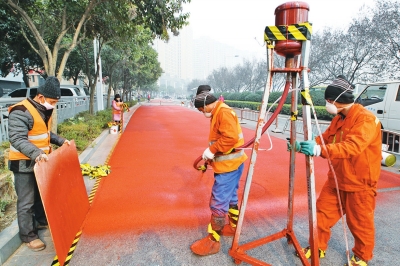“機(jī)動(dòng)車道6米寬,鋪設(shè)‘綠道’的自行車道也為6米寬??磻T了灰黑色的路面,在看到色彩明銳的‘綠道’后肯定覺得眼前一亮?!G道’只是叫法,并不是說道路外觀一定是綠色的,在景觀設(shè)計(jì)中,‘綠道’往往有著更深更廣的內(nèi)涵?!惫こ特?fù)責(zé)人呂先生告訴記者,彩色瀝青厚度僅為1到2毫米,壽命在5年以上,具有警示、防滑、降噪、美觀等特點(diǎn)?!拔覈G道’通常以警示色紅色為主打,主要作用是打造人車分離模式,供騎車者和步行者休閑使用?!?/p>