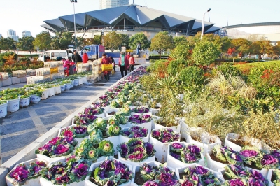 “嘿,快看,真美!感覺好像瞬間穿越到了絢麗多彩的春季!”昨日中午,在鄭東新區(qū)CBD商務(wù)內(nèi)環(huán),幾名市民指著花壇內(nèi)一大片黃、紅、紫三色相間的鮮花說。在這里,記者看到一撥撥工作人員正忙著將一盆盆鮮花擺放到預(yù)先設(shè)置好的花架上。姿態(tài)秀逸、枝葉扶蘇,綴滿鮮艷奪目紅果的南天竹十分吸睛;各種色彩亮麗的花朵,則為冬日的鄭州增添了一抹迷人的色彩;株形如牡丹,葉片形態(tài)美觀多變,觀賞性不輸鮮花的甘藍(lán)更是隨處可見。